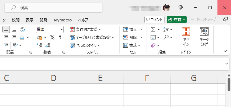 まず左上側から紹介します。左上の名前のところが タイトルバー です 。ブックの名前が ここに表示されます。 その下がタブ 多分 クリックするとリボンがそのタブに属するリボンが表示されます。